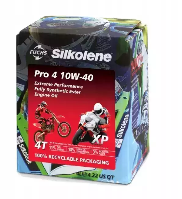 Fuchs Silkolene 4T PRO 4 10w40 XP-призначений для чотиритактних двигунів, відповідає вимогам JASO: MA2 та API: SN, масляна основа, посилена ефірами, призначений для вимогливих користувачів, які віддають перевагу швидкому та спортивному стилю водіння, призначений для сучасних приводів з рідинним або повітряним охолодженням, підготовлені для міських, дорожніх, туристичних і спортивних мотоциклів, відповідає вимогам важких приводів мотоциклів великої потужності, завдяки своїм збалансованим властивостям забезпечує точну роботу зчеплення, ідеально працює на шосейних і гоночних мотоциклах, забезпечує найвищий рівень захисту двигуна та плавне перемикання передач, зменшує витрату палива.