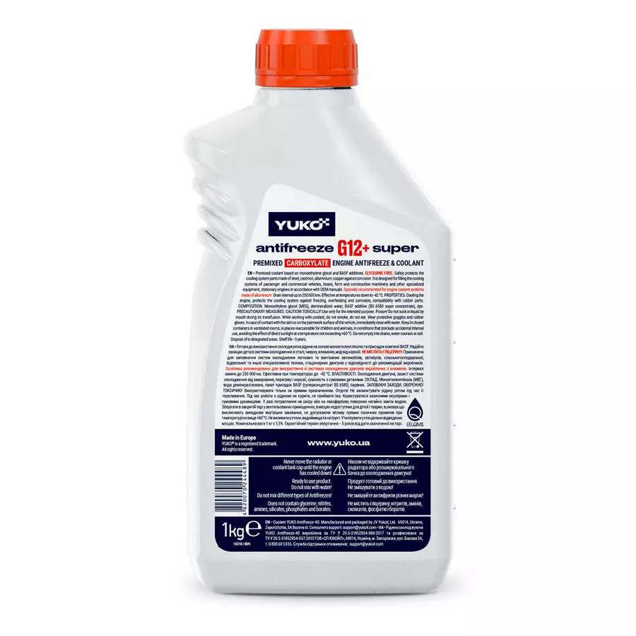 - YUKO Antifreeze Super G12+ (червоний) - захистить ваш двигун від замерзання, перегріву, корозії та формування шкідливих відкладень. Надійний захист металевих деталей двигуна з чавуну, алюмінію, міді та сталі.
