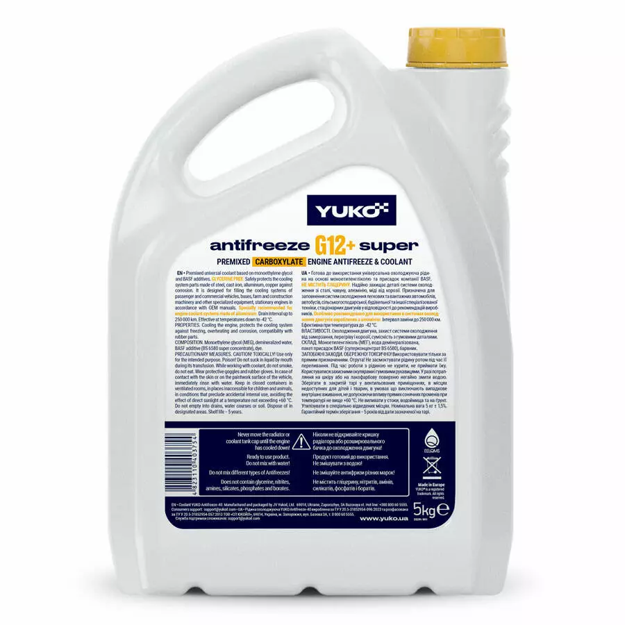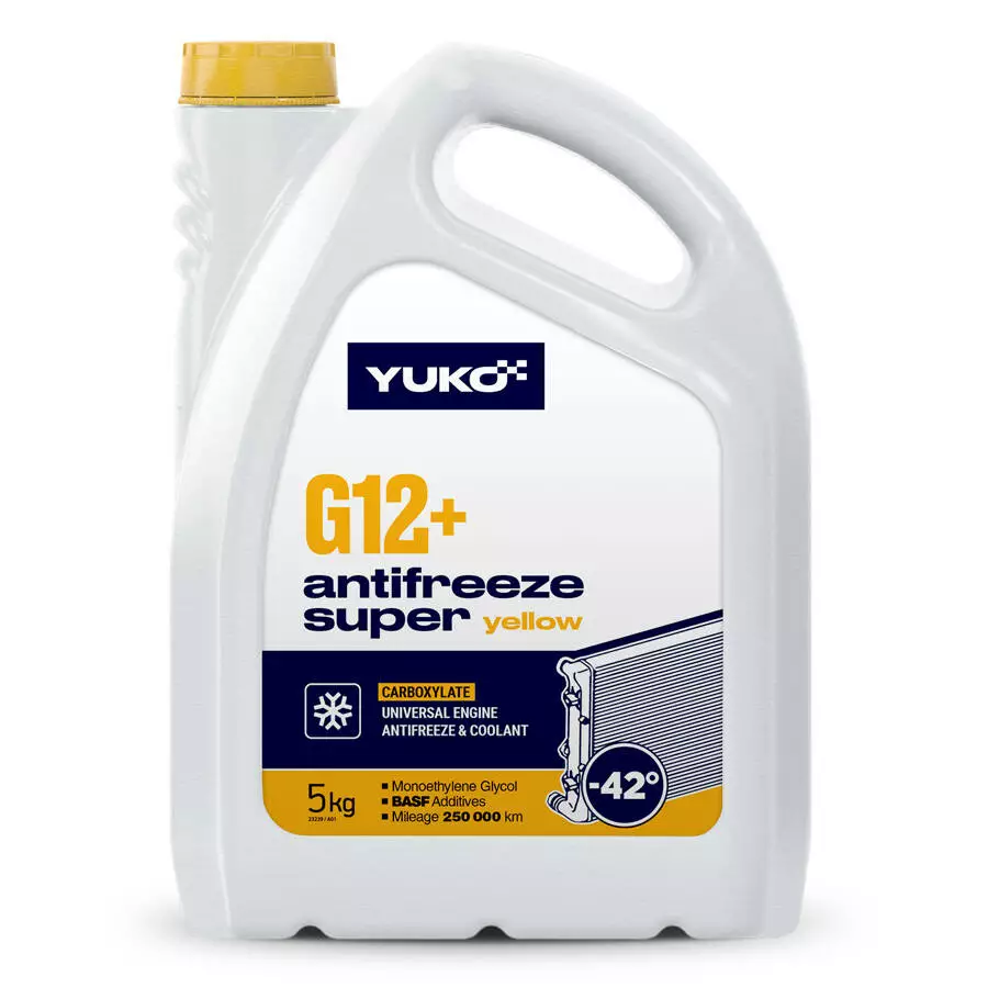 - YUKO Antifreeze Super G12+ (жовтий) - захистить ваш двигун від замерзання, перегріву, корозії та формування шкідливих відкладень. Надійний захист металевих деталей двигуна з чавуну, алюмінію, міді та сталі.