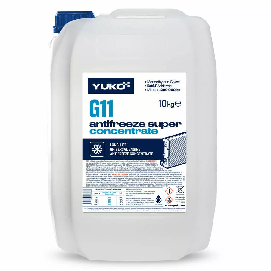 YUKO Antifreeze Concentrate (Super G11 синій) виготовлений на основі моноетиленгліколю і спеціальних антикорозійних присадок. Не містить у своєму складі гліцерину, нітритів, амінів, силікатів, боратів і фосфатів.
