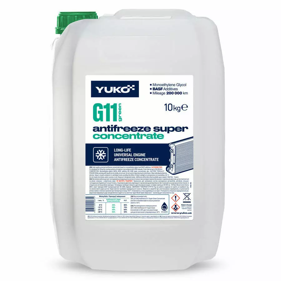 - Yuko Antifreeze Concentrate (Super G11 зелений) виготовлений на основі моноетиленгліколю і спеціальних антикорозійних присадок. Не містить гліцерину, нітритів, амінів, силікатів, боратів і фосфатів.