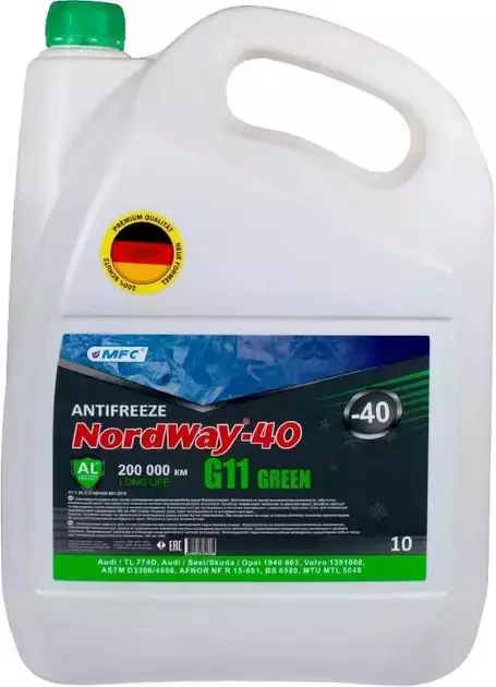 Антифриз NORDWAY-40 (-30С) Green- отова охолоджуюча рідина, забарвлена в зелений колір. Є продуктом на етиленгліколевій основі з неймовірно низькою температурою замерзання, яка дорівнює -30 градусів Цельсія. Містить спеціальні домішки, які забезпечують відмінний захист всіх елементів системи з чорних і кольорових металів від ураження корозією, що дозволяє використовувати антифриз як в сучасних автомобілях з двигунами і радіаторами з сплавів алюмінію і міді, так і для більш старих моделей з чавуну і заліза. Відповідає стандарту G11
