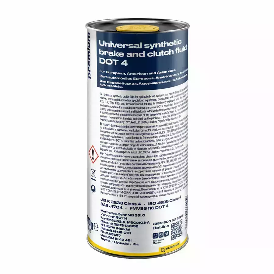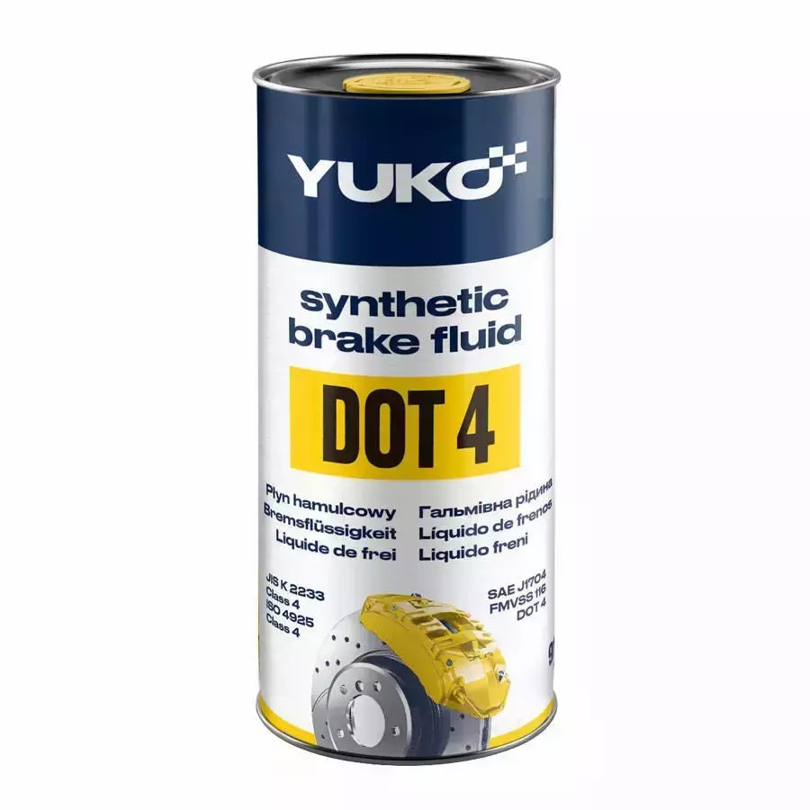 - Гальмівна рідина YUKO DOT-4-Універсальна синтетична гальмівна рідина для гідравлічних гальмівних систем та приводів зчеплення легкових та вантажних автомобілів Рекомендована до використання в техніці, що оснащена дисковими та/або барабанними гальмівними механізмами, де виробником допускається використання гальмівної рідини стандарту DOT 4.