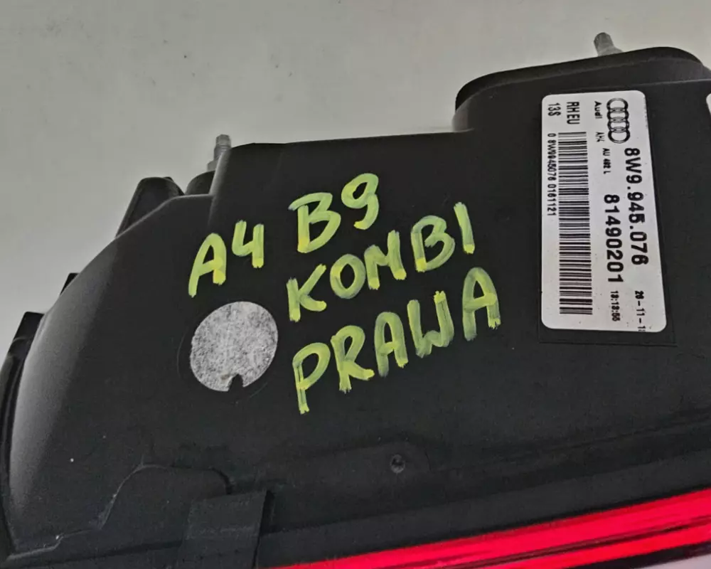 Ліхтар задній (стоп) правий внутрішній 8W9945076 Audi A4 B9 універсал Стан: Вживаний, оригінал. Без сколів, глибоких подряпин та ознак запотівання. Усі кріплення (вуха) цілі. Чому це важливо: Це оригінальна європейська оптика. На відміну від дешевого Китаю, цей ліхтар не вигорить на сонці через рік, не пожовкне і ідеально стане в зазори кузова. Доставка: Пряма поставка з Європи за 3-5 днів. Гарантія: 7 днів на перевірку герметичності та працездатності.