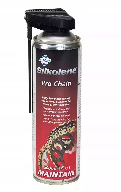 Spray д/змащ.ланцюгів FUCHS Silkolene Pro Chain-100% синтетичне мастило для приводних ланцюгів мотоциклів. Підходить для використання як на дорозі, так і на бездоріжжі.Pro Chain використовується на гоночних мотоциклах для шосе та позашляховиків. 100% синтетичне мастило з винятковими протизносними та антикорозійними властивостями, протистоїть відцентровому викиду. Для всіх типів приводних ланцюгів, включаючи "O-ring" і "X-ring".