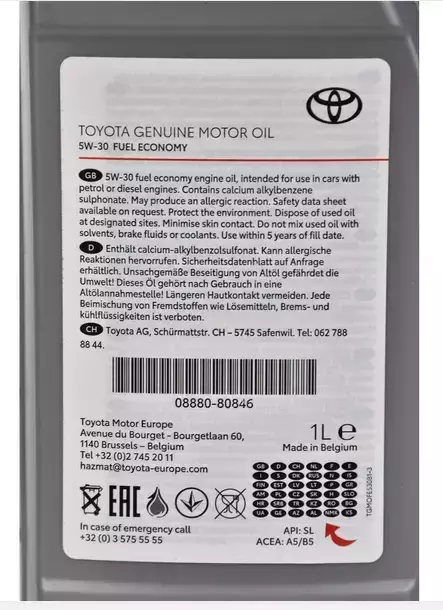 - Toyota 5w30 Fuel Economy-Оригінальна синтетична моторна олива від Toyota. Складається з високоякісних синтетичних базових масел і найсучасніших присадок - призначена для автомобілів з двигунами з іскровим запалюванням. Більшість автомобілів Toyota, оснащених двигунами VVT-i, використовують це високоякісне масло на заводі. Тому Toyota рекомендує заправляти ним усі двигуни VVT-i під час обслуговування.